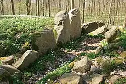 Am nordöstlichen Rand des Waldes liegt ein Dolmenrest, bestehend aus fünf Steinen, der ursprünglich in einem nord-süd orientierten Hünenbett lag. Die kleine Kammer, deren Deckstein fehlt, hat ihren Zugang im Osten. Die Keramikfunde vom gestörten Kammerboden datieren die Anlage in die Megalithphase der Trichterbecherkultur (TBK – 3500–2800 v. Chr.). Eine Axt der Einzelgrabkultur stammt von einer Nachbestattung. Ein kleiner Steinkreis und eine Röse mit einer Steinkiste wurde während der Eisenzeit auf den Hügel gesetzt.