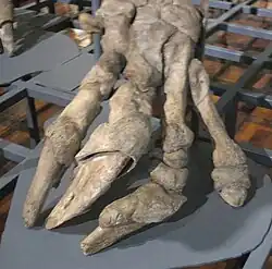 Auch im Körperskelett gab es einzelne Modifikationen. Neben den für alle Nebengelenktiere typischen xenarthrischen Gelenken (Nebengelenke oder Xenarthrale), die an den Querfortsätzen der hinteren Brustwirbel und der Lendenwirbel auftraten und zur festeren Verankerung der Wirbelsäule beitragen sowie seitliche Ausscherungen verhindern,[16] sind vor allem im Bewegungsapparat Besonderheiten zu finden. Der Oberarmknochen bildete einen röhrenförmigen Knochen mit einem ausladenden unteren Ende.[17] So fehlte bei den Megatherien am massiven und vorn und hinten abgeplatteten Oberschenkelknochen der dritte Trochanter – eine markante Knochenerhebung am Schaft als Muskelansatzstelle –, der ansonsten ein typisches Merkmal der Nebengelenktiere ist. Ausnahmen stellen hier die frühesten Formen dar, bei denen dieser noch als leichte Erhebung vorkam.[9] Schien- und Wadenbein tendierten dazu, fest zu verwachsen, im Gegensatz zu anderen Faultiergruppen, mit einer deutlichen Trennung beider Knochen. Auffallende Abweichungen finden sich weiterhin im Fußskelett. Der Hinterfuß war stärker rotiert als bei anderen Bodenfaultieren, so dass das Körpergewicht auf dem äußersten, fünften Strahl und dem Fersenbein ruhte (pedolateral). Besonders deutlich ist dies bei Eremotherium und Megatherium der Fall, doch ist die Drehung des Fußes mehr oder weniger bei allen entwickelten Megatherien vorhanden. Die Rotation zum pedolateralen Fuß ist mit Ausnahme der Megalonychidae bei allen Bodenfaultieren bekannt und entwickelte sich mit unterschiedlichen Varianten innerhalb der einzelnen Linien unabhängig (konvergente Evolution), wobei diese Drehung hauptsächlich im Bereich der Fußwurzel stattfand und etwa das Sprungbein und teilweise die Mittelfußknochen stark überformte. Durch die Drehung wurde der Fuß zusätzlich gekrümmt, wobei die Krümmung nicht so umfassend und hoch ausfiel wie bei den verwandten Nothrotheriidae. Dadurch setzte das Fersenbein bei den Megatherien mit der vollen Länge auf, was von den Nothrotherien abweicht, bei denen nur das hinterste Ende des Calcaneums den Boden berührte.[18] Insgesamt besaß der Hinterfuß eine hoch modifizierte Gestaltung und wies bei allen Megatherien mit bekanntem Fußskelett einen ähnlichen Aufbau auf. So bestand er nur aus den drei äußeren Strahlen (III bis V), wobei der letzte Strahl zudem eine deutlich abgeplattete Form besaß. Von den drei Strahlen wies wiederum bei den späten Megatherien nur der Mittelstrahl (Strahl III) drei Phalangen auf (von denen die ersten beiden miteinander verwachsen waren). Das Vorkommen der Endphalanx am dritten Fußstrahl zeigt an, dass hier eine Klaue ausgebildet war. Die beiden äußeren (Strahlen IV und V) verfügten nur über zwei Zehenglieder, so dass hier demzufolge keine Krallen bestanden. Eine Ausnahme bildet Pyramiodontherium, bei dem am vierten Zeh noch eine kleine, stark reduzierte dritte Phalanx vorkam. Möglicherweise ist dies ein Hinweis darauf, dass frühe Vertreter der Megatherien ebenfalls über dieses Merkmal verfügten.[19][20][9] Der Vorderfuß ist nur bei Eremotherium und Megatherium wirklich gut überliefert. Er besaß bei Eremotherium bei frühen Formen fünf (I bis V) beziehungsweise bei späteren drei Strahlen (III bis V), wobei Klauen nur an den Strahlen I bis IV oder entsprechend III und IV vorhanden waren. Die Hand von Megatherium wies eine zwischen diesen beiden Varianten intermediäre Form auf mit vier Strahlen (II bis V) und Krallen an den Strahlen II bis IV.[21][22] Eine weitere Besonderheit findet sich in dem Verwachsen des innersten Mittelhandknochens (teilweise auch der beiden innersten) und einigen Elementen der Handwurzel, etwa dem Großen Vieleckbein, zu einer Einheit, die als Metacarpal Carpal Complex (MCC) bezeichnet wird.[23]