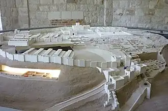 Modell des Tell Megiddo Siedlungsschichten anzeigend, im Vordergrund König Ahabs Pferdeställe (links) und Toranlage (rechts)