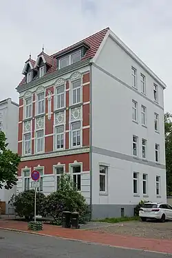 Das dreigeschossige traufständige vierachsige verklinkerte Gebäude mit Mansard-Flachdach mit zwei Giebelgauben wurde um 1904/10 gebaut. Die aufwendigen symmetrischen Fassaden wurden durch horizontale breite Bänder und Fensterrahmungen gestaltet sowie durch figürliche und florale Motive in Brüstungs- und Sturzzonen. Mittig im zweiten Obergeschoss der Straßenfassade befindet sich eine weibliche Figur in Stuck. Im Erdgeschoss wurde sie in Scheinquaderung verputzt.