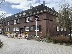 Das zweigeschossige traufständige verklinkerte Eckgebäude auf Keller mit ziegelgedecktem Walmdach wurde 1929/30 für die Gemeinnützige Siedlungsgenossenschaft nach Plänen von P. H. Noris gebaut. Die schlichte Fassade wurde gegliedert und gestaltet durch eine Türlaibung mit Keramikplatten in geometrischen Mustern sowie horizontalen Bändern in Backstein, vor allem seitlich einiger Fenster.[1]