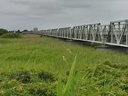 Die stählerne Fachwerkträgerbrücke besteht aus einer Strombrücke mit einer Länge von 61,60 m, aus 14 einzelnen rund 26 m langen Vorflutbrücken und einer Drehbrücke mit einer Länge von 43,70 m. Die Brücke hat eine Gesamtlänge von rund 470 m. Die Fahrbahn ist 3,75 m breit. Durch das umgebende sumpfige Gelände wurde die Brücke auf Holzpfähle gegründet, auf denen die Betonpfeiler ruhen.