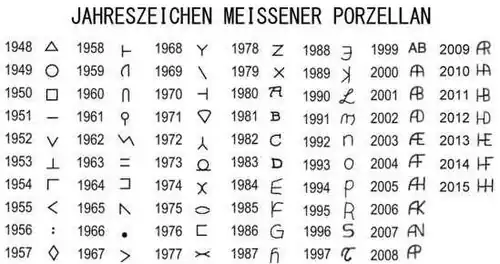 - Jahreszeichen, seit 1948 in den Boden eines jeden Stückes geprägt; dadurch ist es möglich, das Herstellungsjahr des Weißporzellans zweifelsfrei festzustellen