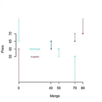 Für einen Preis von 60 € oder 65 € wird somit am meisten Umsatz ermöglicht. Es kann jeweils eine Menge von 40 Stück ausgeführt werden. Jedoch besteht für 60 € ein Überhang von 10 Stück auf der Kaufseite, für einen Preis von 65 € ein Überhang von 30 Stück auf der Verkaufsseite. Es wird nun der Preis mit dem geringsten Überhang gewählt, d. h. es entsteht ein Preis von 60 €.[2]