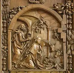 Vorbilder der Verkündigungsszene dürften Holzschnitte und Kupferstiche sein, so kann in diesem Relief ein Marienleben Dürers als Anregung gedient haben. Dies zeigt sich z. B. in dem Verkündigungsengel mit seinen weit gebreiteten Flügeln. Die Gestaltung von Maria wurde dagegen im Relief monumentalisiert und die Gewandungen dem schweren Faltenwurf des gotischen Stils angepasst.