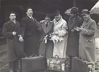 ![]() Das Meistersextett tritt am 20. April 1936 im Gebouw voor Kunsten en Wetenschappen in Den Haag auf und wird reisefertig im Bild festgehalten (von links): Erwin Bootz, Robert Biberti, Ari Leschnikoff, Fred Kassen, Walther Blanke und Richard Sengeleitner. | |