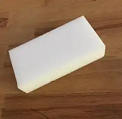 - Offenporiger Schaum aus Melaminharz wird auch als „Schmutzradierer“ genutzt.[14] Die Reinigungswirkung beruht auf den abrasiven Harzpartikeln, die beim Reiben entstehen. Die Partikel werden, zusammen mit den Schmutzpartikeln, vom Schwamm aufgenommen. Der Schwamm verbraucht sich somit beim Reinigen.