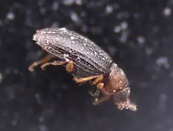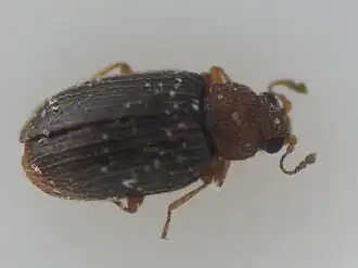 Die Käfer sind 1,51–1,64 mm lang.[1] Die Männchen sind in der Regel kleiner als die Weibchen.[2] Die ausgewachsenen Käfer sind zweifarbig, wobei Kopf und Halsschild (Pronotum) gelbbraun gefärbt sind, die Elytren (Flügeldecken) dagegen dunkelbraun. Der Körper der Käfer ist mit kurzen anliegenden weißen Härchen bedeckt. Die 11-gliedrigen Fühler sowie die Beine sind gelbbraun. Die 9-gliedrige Fühlergeißel setzt sich aus 6 Funikulargliedern sowie 3 Keulengliedern zusammen. Die vorderen Tibien sind ohne Zähnchen. Die Tarsen sind häufig angedunkelt. Das dritte vordere Tarsenglied besitzt einen spitzen Zahn, der nach vorne gebogen ist.[3] An den Hinterecken des Halsschilds befindet sich jeweils ein kleines Zähnchen. Der Seitenrand des Halsschilds ist auf Höhe der Mitte schwach angewinkelt.[1][2] Das erste Sternit weist Schenkellinien auf.[2] Der Aedoeagus ist in ventraler Ansicht gleichmäßig stark gebogen.[2] In lateraler Ansicht endet der Aedoeagus in einer gleichmäßig scharfen Spitze.[2]