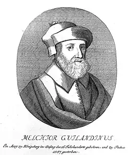 - Giovanni Battista de Toni: Melchiorre Guilandino. In: Gli scienziati italiani dall’inizio del medio evo al nostri giorni; repertorio biobibliografico dei filosofi, matematici, astronomi, fisici, chimici, naturalisti, biologi, medici, geografi italiani. Attilio Nardecchia, Rom 1921, S. 73–76 (Digitalisat).