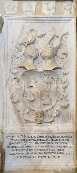 „MELCHIORI A FROINDSPERG GEORGII EQVITIS SPLENDIDISS(IMI) / CAESARIANIQ(VE) GERMANICI PEDITATVS BELLO ITALICO / PRAEF(ECTI) FILIO • QVI DVM HONESTISS(IME) ORDINES DVCERET • / IN VRBE IDIB(VS) IANVARII • M • D • XXVIII • IMMATVRA MORTE / INTERCEPTVS EST XXI AETATIS SVAE ANNO / GASPAR SVVEGLER ALVMNVS QVAESTOR EXERCITVS / MILITVM TRIBVNVS B(ENE) M(ERENTI) P(OSVIT)“