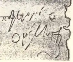 - ↑ D H. III. 322: ...in tumulo, in quo praedicti Ismahel ducis Apuliae qui et Melo vocabatur, ossa clauduntur „im Grab, in dem die Gebeine des vorgenannten Ismahel, des Herzogs von Apulien, der auch Meles genannt wird, eingeschlossen sind“