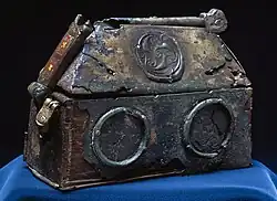 Das Reliquiar von Melhus in Overhalla hat eine Grundfläche von nur 12 × 8 Zentimetern. Die Wände sind teilweise mit Bronzeplatten bedeckt und bestehen aus Eibenholz. Zusammen mit dem Reliquiar wurde ein vergoldeter Bronzebeschlag gefunden, der vermutlich auf einem Kirchenobjekt stand. Das Reliquiar wurde 1906 auf einem Grabhügel auf dem Hof Melhus in Overhalla geborgen. Bei der Untersuchung des Hügels fand das Museum zwei Gräber: einen Mann und eine Frau, die zusammen in einem Boot begraben worden waren, sowie mehrere wertvolle Gegenstände.
