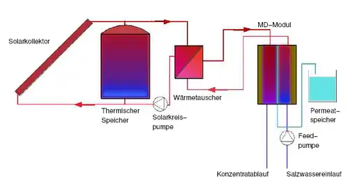 Die Membrandestillation, besonders in der Ausführung als Spiralwickelmodul nach einem Patent der Firma GORE aus dem Jahr 1985, ist bestens für kompakte, vollkommen solarbetriebene Entsalzungsanlagen für kleine bis mittlere Tageskapazitäten ≤ 10.000 l/Tag geeignet. Im Rahmen des 2003 begonnenen EU-Projekts MEMDIS wurden am Fraunhofer-Institut für Solare Energiesysteme (ISE) zusammen mit Projektpartnern begonnen, MD-Module zu konstruieren und zwei verschiedene solar betriebene Systeme zu entwickeln, zu installieren und zu untersuchen. Bei dem ersten System handelt es sich um eine als Kompaktsystem bezeichnete Anlage zur Erzeugung von ca. 100–120 l/Tag Trinkwasser aus Meer- oder Brackwasser. Zielsetzung bei diesem Anlagendesign war es vor allem, ein einfach aufgebautes, energieautarkes, wartungsfreies und robustes System für Zielmärkte in infrastrukturschwachen Gebieten der ariden und semiariden Zonen zu schaffen. Das zweite System war eine als Zweikreissystem bezeichnete Anlage mit einer Kapazität von etwa 2.000 l/Tag. Der Kollektorkreis wurde hier von dem Entsalzungskreis durch einen salzwasserbeständigen Wärmeüberträger entkoppelt.[1] Ausgehend von diesen beiden Systemen wurden mehrere Prototypenanlagen entwickelt, installiert und vermessen.