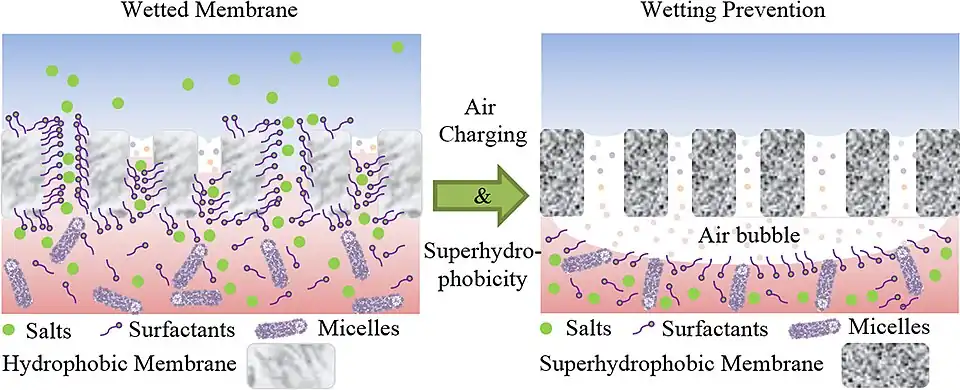 Mehrere Forscher haben verschiedene Ansätze zur Kontrolle der Benetzung bei Membrandestillation vorgeschlagen. Der Schwerpunkt lag vor allem auf der Weiterentwicklung der Membranherstellung, um eine geringe Affinität zwischen der Flüssigkeit und dem Polymermaterial zu gewährleisten. Dies wurde hauptsächlich durch Modifizierung der geometrischen Struktur der Membranoberfläche und der Oberflächenchemie erreicht. Mehrere Studien untersuchten auch die Integration von Filtrationsprozessen als Vorbehandlungsschritte für Membrandestillation. Zur Kontrolle der Benetzung werden in weiteren Studien Betriebsbedingungen und neuartige Strömungstechniken wie die Wiederaufladung einer Luftschicht auf der Membranoberfläche eingesetzt.[7]
