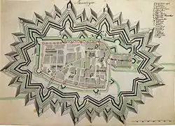 Um die gesamte Stadt wurde ein Graben gezogen, der auf der Ost- und Südseite sehr flach verlief, da auch dort der Schutz durch verschiedene Bäche gegeben war. Der Norden und der Westen konnten verhältnismäßig schlecht verteidigt werden, was ein ausgeklügeltes System von Schanzen, Gräben und Mauern nötig machte.
