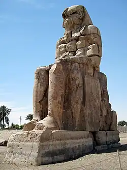 Pharao Amenophis III., Vater des „Ketzerkönigs“ Echnaton, regierte das altägyptische Neue Reich in der ersten Hälfte des 14. vorchristlichen Jahrhunderts. Die ihn darstellenden Sitzfiguren der Memnonkolosse wurden 1379 v. Chr.[9] an den Seiten des Eingangs seines Toten- und Gedenktempels in Theben errichtet, der sich westlich hinter den Statuen auf einer Fläche von ungefähr 700 Metern Länge und 550 Metern Breite erstreckte.[10] Der Tempel war weitgehend aus Lehmziegeln errichtet, was seinen späteren schnellen Verfall beförderte. Nach Aufgabe der Instandhaltung lösten sich die Ziegel des in den Nilauen gelegenen Amenophis-Tempel durch die jährlich erfolgenden Überschwemmungen mehr und mehr auf. Haltbarere Teile der Tempelruine wurden von späteren Pharaonen für den Bau ihrer Totentempel verwendet.[2]