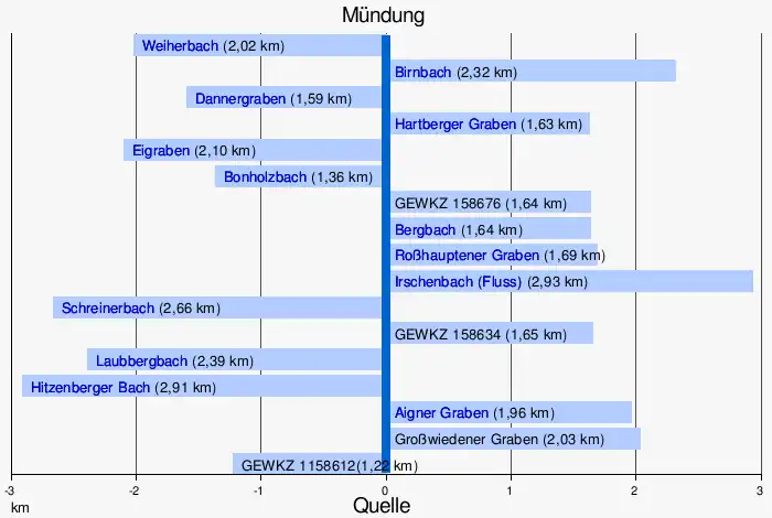 Rechte Nebenflüsse Irlberger Graben, Großer Wiedener Graben, Aigner Graben, Irschenbach, Roßhauptener Graben, Bergbach, Reinbach, Kreuzkirchner Bach, Weiherhofgraben, Birnbach