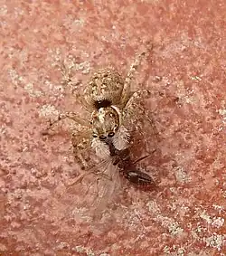 Ist die Fliege mit dem Abdomen (Hinterleib) zur Spinne gerichtet, vollführt diese den bereits oben erläuterten Sprungangriff. Steht die Fliege hingegen frontal oder lateral der Spinne gegenüber, umkreist diese das anvisierte Beutetier, bis wieder dessen Abdomen das nächstgelegene Körpersegment zur Spinne ist. Ist dies erfolgt, versucht sich die Spinne der Fliege von hinten anzunähern. Ändert die Fliege jedoch ihre Haltung in eine für die Spinne ungünstige Position, weicht diese zurück und beginnt erneut mit dem Umkreisen sowie dem Anschleichen an die Fliege. Der Sprungangriff erfolgt, sobald die Fliege bei günstiger Position in Reichweite der Spinne gelangt.