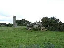 Etwa 500 m östlich steht der 3,8 m hohe, 2,4 m breite und 2,2 m dicke, massige Menhir von Bodquelen.