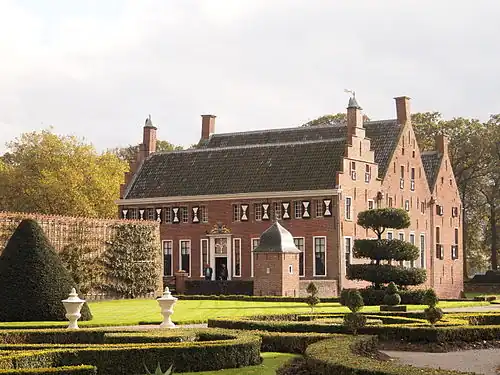Es gibt einen großen Garten mit Teehaus. Die dort aufgestellten Statuen sind Kopien der Originale aus dem 18. Jahrhundert. Ferner findet sich hier auch eine Sonnenuhr aus dem Jahr 1722. Neben dem Lustgarten gibt es einen kleinen Irrgarten, wie es früher bei vielen Landhäusern üblich war. Daneben befindet sich ein Obstgarten mit zahlreichen alten Apfel- und Birnensorten und auch ein Küchengarten. Bei der Auswahl der Gemüse und Kräuter in diesem Garten hat man sich an dem Familienkochbuch aus dem 18. Jahrhundert orientiert.