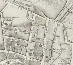 In den ersten Jahren versammelte sich die Gemeinde noch in Privathäusern. Erst im Jahr 1675 errichteten mennonitische Walfänger aus fünf Prozent des Erlöses einer Walfangsaison eine Holzkirche an der Großen Freiheit. Die Große Freiheit bezieht ihren Namen von den Religions- und Gewerbefreiheiten, die Glaubensgemeinschaften und zunftfreie Handwerker damals in Altona genossen. Beim Schwedenbrand im Großen Nordischen Krieg wurde die Holzkirche zusammen mit großen Teilen der Stadt Altona zerstört. Doch schon 1715 wurde an gleicher Stelle eine neue Steinkirche aufgebaut, die bis 1915 von der Gemeinde genutzt wurde. Bei dieser vom Altonaer Stadtbaumeister Claus Stallknecht erbauten Kirche handelte es sich um einen einschiffigen, turmlosen Backsteinbau mit pfannengedecktem Mansarddach und einem schlichten Kirchenraum mit Tonnendecke. Die Fassade war barock mit Sandsteinen ausgestaltet.[1] Wie andere täuferisch-mennonitische Kirchen lag diese erste Steinkirche noch nicht unmittelbar an der Straßenfront. Vor dem Kirchengebäude entstanden 1772 und 1850 Gemeinde- und Pfarrhäuser, die die Kirche auch baulich von der Straßenlinie trennten. Nachdem sich das Viertel um die Große Freiheit jedoch immer deutlicher in ein Amüsierviertel wandelte, entstanden erste Pläne für einen Umzug der Gemeinde. 1915 wurde schließlich die neue Kirche an der Mennonitenstraße in Altona-Nord eingeweiht, die bis heute der Gemeinde als Versammlungsort dient. Kirche und Gemeindehäuser an der Großen Freiheit 73/75 wurden an die Stadt verkauft, die das Gebäudeensemble in den folgenden Jahren an die Hamburger Großstadt-Mission übergab.[2] Im Zweiten Weltkrieg wurde das Kirchengebäude an der Großen Freiheit schließlich komplett zerstört. Nur Mauerreste wie die ziegelgemauerte Apsis konnten bei späteren Ausgrabungen noch dokumentiert werden.[3] Die Gemeindehäuser blieben jedoch bestehen und stehen inzwischen unter Denkmalschutz.[4] Bis 1795 hielt die Gemeinde noch am Niederländischen als Gottesdienstsprache fest.