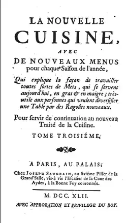 - Les Soupers de la Cour, ou l’art de travailler toutes sortes d’aliments pour servir les meilleures tables, Paris, 1758