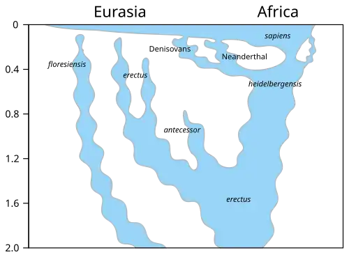 Inzwischen wiesen mehrere Studien darauf hin, dass archaische Verwandte des Menschen in geringer Menge (1–2 %) Spuren im Genom von unterschiedlichen Populationen des Menschen der Gegenwart hinterlassen haben. Zunächst wurde das für den Neandertaler in Europa und Westasien nachgewiesen,[24][25] etwas später für den Denisova-Menschen in Südostasien[26][27] und zuletzt wurde solcher Genfluss archaischer Menschen zu Homo sapiens auch für Afrika postuliert.[28][29][30]
