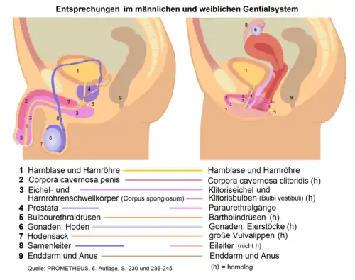 Geschlechtsorgane bei Mann und Frau, von denen einige aus denselben embryonalen Anlagen entstehen, also homolog sind.[1]