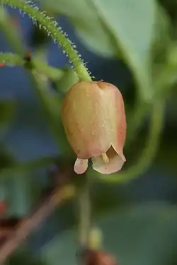 Die wechselständigen und an den Zweigenden gehäuft angeordneten Laubblätter sind in Blattstiel und Blattspreite gegliedert. Der Blattstiel ist 2 bis 4 Millimeter lang. Die länglich-elliptischen bis oval-elliptischen, 3 bis 6 Zentimeter großen sitzen an einem Die Blattränder sind drüsig-gewimpert, das heißt, es stehen Haare seitwärts vom Blattrand ab. Die Blattunterseite ist hellgrün gefärbt, während die Blattoberseite dicht-drüsig oder behaart ist.[1]