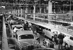 Im Zweiten Weltkrieg wurde Daimler-Benz zu einem der größten Produzenten von Rüstungsgütern. Dies wurde auch gewährleistet durch den Einsatz von Zwangsarbeitern, die nach Deutschland verschleppt wurden, davon waren in Sindelfingen in Daimler-eigenen Werkslagern etwa 3.000 Frauen, Kinder und Männer vorwiegend aus der Sowjetunion und Polen.[3] Aufgrund des industriellen Rüstungspotentials wurde die Stadt Sindelfingen im Krieg sehr stark zerstört, auch das Werk Sindelfingen erlitt große Verluste. Ab 1945 wurde mit dem Wiederaufbau begonnen, die Produktion des Typ 170 V wurde als einzige weitergeführt. 1950 wurde aufgrund der steigenden Produktion und der Verlagerung der PKW-Endmontage vom Werk Untertürkheim nach Sindelfingen der Zweischichtbetrieb in Sindelfingen eingeführt. Im Jahr 1955 wurden 80.500 PKW gefertigt. 1972 erschien mit dem Mercedes-Benz W 116 die erste S-Klasse. Sie wurde einzig in Sindelfingen gefertigt, was sich bis heute mit dem aktuellen Modell der S-Klasse (W 223) nicht geändert hat.