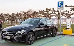 Der Ottomotor-Plug-in-Hybrid C 350 e verfügt über eine in das Getriebegehäuse integrierte E-Maschine mit einer Maximalleistung von 60 kW und einem Drehmoment von 340 Nm. Im Zusammenspiel mit dem Vierzylinder-Benzinmotor M 274 DEH 20 LA ergibt sich eine Systemleistung von 205 kW (279 PS) und ein Systemdrehmoment von 600 Nm.[17] Nach NEFZ kann eine rein elektrische Reichweite von 31 km erreicht werden. Da Nebenaggregate wie die Wasserpumpe, die Vakuumpumpe, die Lenkhilfepumpe und der Klimakompressor elektrifiziert wurden, entfiel der konventionelle Riementrieb.[18] Der Generator entfiel ebenfalls, das 12-V-Bordnetz wird über einen DC/DC-Wandler aus dem Hochspannungsbordnetz gespeist.[18] Hinter der Hinterachse ist die ca. 100 kg schwere, kühlmittelgekühlte Lithium-Ionen-Batterie mit 6,38 kWh Energieinhalt untergebracht, wodurch sich das Gepäckraumvolumen von 480 auf 335 Liter (Limousine) bzw. von 490–1510 auf 450–1470 Liter (T-Modell) verringert.[19][20] Es handelt sich um einen aus 88 in Serie verschalteten Zellen (22 Ah, 3,3 V) bestehenden Lithium-Eisenphosphat-Akkumulator mit einer Nennspannung von 290 V.[18] Insgesamt ist der C 350 e 230 kg schwerer als der vergleichbare C 250.[17]
