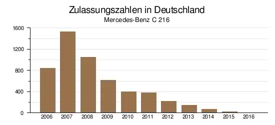 Zwischen 2006 und 2016 sind in der Bundesrepublik Deutschland 5269 Mercedes-Benz C 216 neu zugelassen worden. Mit 1532 Einheiten war 2007 das erfolgreichste Verkaufsjahr.