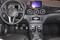 Das Interieur wurde stark verändert. Der W 246 bekam in der Topversion das mit Leder beklebte Dreispeichen-Aluminium-Doppelstreben-Lenkrad aus dem CLS. Ebenfalls neu war das Kombi-Instrument mit einem zentralen 11,4 cm großen Multifunktions-Display und weiterhin zwei analogen Rundinstrumenten, die jeweils ein weiteres kleines Rundinstrument enthalten. An der Instrumententafel ist ein großes Zierelement angebracht. Das Zentral-Display mit einer Diagonale von 14,7 cm (ab November 2014 optional 17,8 cm) in der Basis und 17,8 cm serienmäßig bei der Wahl des Navigationssystems, das sich über den drei Lüftungsdüsen aus Aluminium befindet, ist in das Instrumententafel-Oberteil integriert, ähnlich wie beim SLS AMG.[7] Unterhalb des Zierelementes mit den Lüftungsdüsen befindet sich eine bis hin zur Armauflage fließende Bedieneinheit, die aus zwei getrennten Abteilen besteht; oben beginnend mit der Bedienung des Radios und des Navigationssystems und darunter die Klimaregler. Die Bedienknöpfe sind aus Aluminium gefertigt. Der Schalthebel entfällt bei Modellen mit dem Doppelkupplungsgetriebe, die Handbremse wurde bei allen Modellen durch eine elektrische Parkbremse ersetzt, so dass sich an deren Stelle nun zwei Staufächer befinden. Die Bedienung des Radios und Navigationssystems erfolgt über einen sich vor der Mittelarmlehne befindenden Dreh- und Drückknopf.