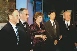 Die Flüssigkristallforscher Matthias Bremer, Melanie Klasen-Memmer und Kazuaki Tarumi bei der Verleihung des Deutschen Zukunftspreises 2003 durch Bundespräsident Johannes Rau