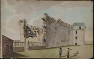 ![]() Lithografie der Ruinen von Merrion Castle, um 1770 | ||