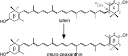 meso-Zeaxanthin, Lutein und (3R,3′R)-Zeaxanthin sind die häufigsten Carotinoide in der Macula lutea, die in einem Verhältnis von 1:1:1 vorkommen und zusammen als Makulapigment (MP) bezeichnet werden.[4] meso-Zeaxanthin ist im Mittelpunkt der Makula konzentriert, wo es etwa 50 % des MP ausmacht, während Lutein in der peripheren Makula dominiert.