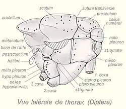 Die beiden hinteren Thoraxsegmente werden bei den geflügelten Insekten oft zum Pterothorax zusammengefasst (nach griechisch pteron: „Flügel, Feder, Flosse“). Die durch Nähte (Suturen) gegeneinander abgesetzten Teile des Exoskeletts im Abschnitt des Mesothorax, allgemein als Sklerite bezeichnet, tragen jeweils besondere Namen, diese Bezeichnungen sind zum Beispiel zur präzisen Ansprache bei der Bestimmung von Bedeutung. Allgemein sind die Sklerite des Pterothorax miteinander zu einer geschlossenen, unbeweglich miteinander verbundenen Struktur verwachsen, sodass den Flügeln und der antreibenden Flugmuskulatur ausreichend Stabilität gegeben ist. Der vordere Rumpfabschnitt (Prothorax) kann ebenfalls verbunden sein, ist meist aber durch eine gelenkige, bewegliche Verbindung abgesetzt; in diesem Fall ist der Rumpf in sich etwas beweglich, die Teile können zum Beispiel in gewissem Maß gegeneinander verdreht werden.[2]