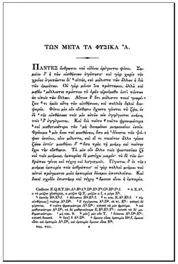 Unter der Sammelbezeichnung Metaphysik haben Aristoteles’ Schüler, vermutlich der Peripatetiker Andronikos von Rhodos im 1. Jahrhundert v. Chr., unterschiedliche, zum Teil unabhängige Schriften in 14 Büchern zusammengefasst. Der Titel, so eine verbreitete, jedoch veraltete Theorie, bezeichne daher schlicht die Position in dieser Edition: Die Bücher, die der Physik nachgeordnet sind. Aristoteles selbst nannte den Gegenstand seiner Wissenschaft „Erste Philosophie“ (πρώτη φιλοσοφία protē philosophia) oder auch „Theologische Wissenschaft“ (ἐπιστήμη epistēmē theologikē). Neuere Forschungen vertreten die Auffassung, dass der Name schon vor Andronikos, möglicherweise bereits im frühen Peripatos inhaltlich verwendet wurde,[2] weil der Gegenstand sich auf das bezieht, was hinter den Dingen steht, auf den ersten Urgrund. Diese Auffassung findet sich schon bei Alexander von Aphrodisias, einem frühen Aristoteles-Kommentator.[3]