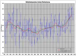- ↑ Deutscher Wetterdienst (Hrsg.): 200 Jahre meteorologische Beobachtungen auf dem Hohenpeißenberg 1781–1980. Seite 12–13. Siehe auch: Literatur. Datengrafik ab 1781 siehe auch DWD ( vom 23. September 2015 im Internet Archive) (PDF; 58 kB)