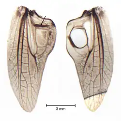 Die untersuchten Heuschrecken (30 Männchen, 10 Weibchen) stammen aus der Garchinger Heide nördlich von München. Die Mittelwerte für die Längen der Vorder- und Hinterflügel der Männchen betragen 8,52 Millimeter beziehungsweise 4,62 Millimeter. Bei den Weibchen sind die Vorderflügel im Mittel 7,83 Millimeter, die Hinterflügel 4,75 Millimeter lang. Der Mittelwert für die Schrillleiste des linken Flügels liegt bei 1,67 Millimeter und ist durchschnittlich mit 90,17 Schrillzähnen besetzt. Der Mittelwert für die zurückgebildete Schrillleiste des rechten Flügels beträgt nur 1,13 Millimeter und ist im Mittel mit lediglich 52,10 Schrillzähnen besetzt.[1] Auf dem rechten Flügel ist der Spiegel gut entwickelt. Seine dünne, unpigmentierte Membran ist in einen Chitinrahmen eingespannt, dessen Innenrand verstärkt ist (Bild).