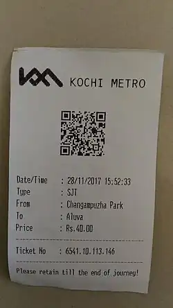 Die Ticketpreise der Metro sind etwas höher als des Stadtbus-Netzes.[105] Es besteht die Möglichkeit, eine spezielle EMV-Chipkarte mit Guthaben aufzuladen und anschließend zum Bezahlen der Ticketpreise in der Metro Kochi und anderen ÖPNV-Angeboten der Stadt, darunter Busse und Fähren, zu nutzen.[135]