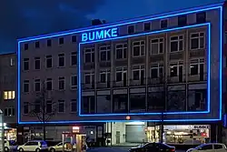 Abends mit blauen Neonröhren beleuchtete Fassade der Firma Bumke am Engelbosteler Damm 5;