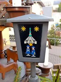 Die Mettenlaterne (regional auch Christ- oder Weihnachtslaterne) ist eine besonders gestaltete Laterne, die als Mettenlicht, heute oft von Kindern, in die Christvesper, Christ- oder Finstermette getragen wird.[1] Der Brauch ist im Erzgebirge, Vogtland und auch in einigen Teilen Thüringens verbreitet. Besonders im Erzgebirge werden die Mettenlaternen während der Christvesper oder Christmette um den Altar oder vor die Kirchentür gestellt.