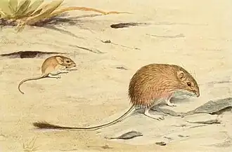 Mexikanische Rauhaar-Taschenmaus (rechts) und eine Seiden-Taschenmaus (Perognathus flavus) | ||||||||||||