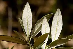 Die wechselständig an den Zweigen angeordneten Laubblätter sind 5 bis 10 Zentimeter lang[6] und in Blattstiel sowie -spreite gegliedert. Der 1,5 bis 13 Millimeter lange Blattstiel ist dicht flaumig behaart.[1] Die einfache, ledrige Blattspreite ist bei einer Länge von 4,5 bis 12 Zentimeter und einer Breite von 1,5 bis 4 Zentimeter schmal-eiförmig bis eiförmig,[1] schmal-länglich, lanzettlich,[6] länglich-lanzettlich oder elliptisch[5] mit keilförmiger bis stumpfer Spreitenbasis und spitzem oder zugespitztem oberem Ende.[1] Der stark umgebogene Blattrand ist ganzrandig oder im vorderen Bereich[5] gesägt mit bis zu elf Spitzen.[1] Die Blattspreite ist anfangs von hellroter, später von gelbgrüner Farbe[5]. Die glänzend gelb-grüne[6] oder dunkelgrüne[7], deutlich runzelige Blattoberseite ist spärlich mit Sternhaaren (Trichome) bedeckt oder kahl und die -unterseite dicht lohfarben, weiß, silbrig wollig behaart.[7][1] Der Abwurf der Altblätter geschieht während des Austriebs der neuen Blätter im Frühjahr[5].