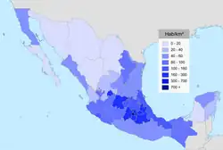 Im Jahr 2023 lebten 82 Prozent der Einwohner Mexikos in Städten.[10] Die größten Städte Mexikos, allesamt Millionenstädte, sind Mexiko-Stadt, Guadalajara, Monterrey, Ecatepec de Morelos, Puebla, Nezahualcóyotl, Juárez, Tijuana, León und Zapopan. Sie liegen überwiegend im Staatsinneren, dagegen sind die Küstengebiete eher dünn besiedelt.[11]