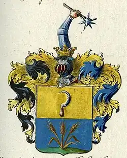 Blasonierung: Gold über Blau geteilt. Oben eine eiserne gezahnte Sichel mit holzfarbenem Griff, unten wachsend aus grünem Rasen drei goldene Ähren an dergleichen Blätterhalmen. Auf dem gekrönten Helm mit rechts schwarz-goldenen, links blau-goldenen Helmdecken ein aus der Krone wachsender geharnischter Arm einen Morgenstern schwingend.[1] Der Schild wird auch goldbordiert dargestellt.