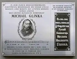 - Zu Glinkas Ehren wurden die drei russischen staatlichen Konservatorien in Nischni Nowgorod,[5] Nowosibirsk[6] und Magnitogorsk[7] sowie die Glinkastraße in Berlin-Mitte nach ihm benannt.