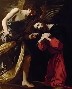 Die Contarelli-Kapelle (die Begräbniskapelle des französischen Kardinals Mathieu Cointrel, im Italienischen Contarelli genannt) in der Kirche San Luigi dei Francesi wurde mit drei Arbeiten zum Apostel und Evangelisten Matthäus[115] ausgestaltet: die beiden Seitenflügel mit der Berufung des Hl. Matthäus zum Apostel und dem Martyrium des Hl. Matthäus, der Altar mit dem Evangelisten Matthäus und der Engel (1599–1602). Eine erste Fassung des Evangelisten mit dem Engel (1599, Hl. Matthäus; zuletzt in deutschem Besitz, seit 1945 verschollen) zeigte einen barfüßigen bäuerlichen Matthäus mit übereinandergeschlagenen Beinen und einem „kecken Jungen“ (Roberto Longhi) als Engel, das von der Kongregation abgelehnt wurde und in der Sammlung Giustinianis landete.[116]