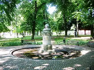 Das Gelände des heutigen Parks war einst eine Sumpfniederung, die mit Bäumen bewachsen war. 1873 rodete man die Fläche und legte den Wilhelmsplatz an. Ein Jahr später errichtete man dort ein Denkmal, um an 100 Soldaten des Gubener Stadtbataillons zu erinnern, die im Deutsch-Französischen Krieg 1870/1871 gefallen waren. Auf Initiative des Stadtrates Adolph Jackeschky wurde um den Platz herum der heute noch erhaltene Park angelegt. Ihm zu Ehren stellten die Bewohner Gubins einen Findling aus dem ehemaligen Stadtwald im heutigen Dzikowo auf und brachten eine Gedenktafel an. Zum 100. Todestag Mickiewicz wurde die Tafel abgenommen und durch eine Marmorplatte zu Ehren des Nationaldichters ersetzt.[1] Südlich des Findlings befindet sich ein Brunnen, der ursprünglich vor der Stadt- und Hauptkirche aufgestellt war. Auf dem Sockel befand sich eine 1791 hergestellte Skulptur „Karpfenjunge“ eines Bildhauers der Königlichen Akademie in Berlin. Der Verschönerungsverein der Stadt setzte sie 1908 auf einen Sockel mit vier Fischköpfen an den heutigen Standort um. Die Figur ist nicht mehr erhalten. Auf dem Gelände befinden sich Eichen, Linden, Ahorn, Lärche, Kastanien, Akazien, Lebensbäume, Eiben, Ulmen, Götterbaume und Buchen.